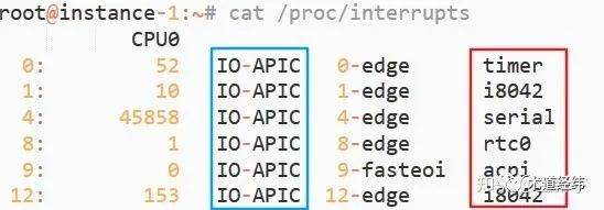 其中,"name"是中断控制器的名称,就是我们在"/proc/interupts"中看到的那个,比如下图中蓝框所示的的"IO-APIC"。