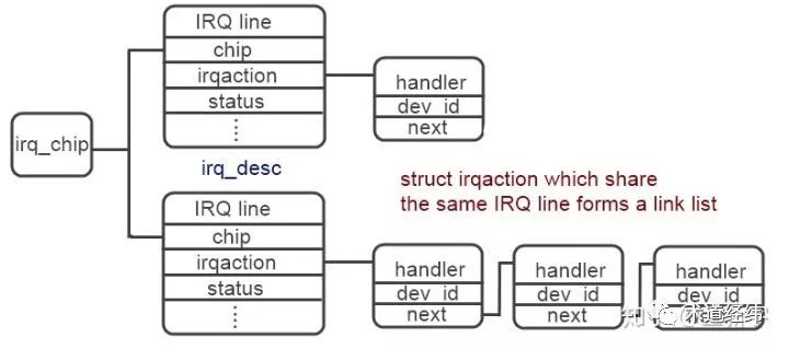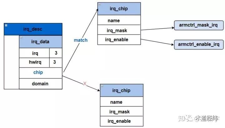 其中,"chip"就指向了这个IRQ所挂接的中断控制器,两者的绑定是通过irq_set_chip()函数完成的。