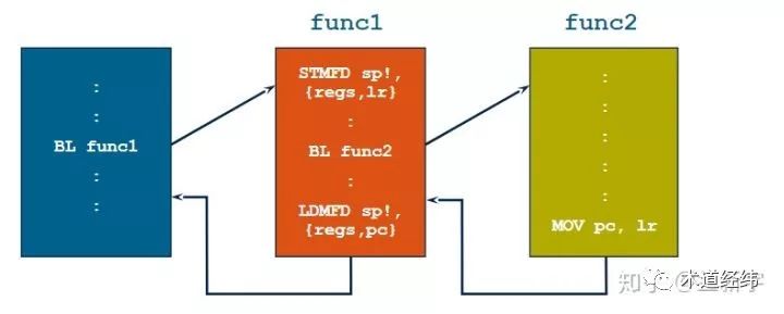 有的时候,"B"后面还会跟上一个"L","L"代表记录函数返回地址的link register(R14/X30),暗示接下来的跳转其实是一个子函数调用,类似于x86中的"call"指令。