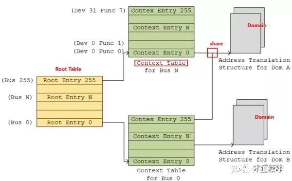 BDF号被分为了两个部分,第一部分Bus占8个bits,作为Root Table的索引;第二部分Device和Function分别各占5个bits和3个bis,作为Context Table的索引。这里Root Table和Context Table分别类似于SMMU中Stream table的第一级和第二级,而BFD的作用就等同于SMMU中的StreamID。