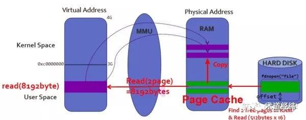 先来看下用户进程调用read()在linux中是怎样实现的。比如要读取磁盘上某个文件的8192个字节数据,那么这8192个字节会首先拷贝到内存中作为page cache(方便以后快速读取),然后再从page cache拷贝到用户指定的buffer中,也就是说,在数据已经加载到page cache后,还需要一次内存拷贝操作和一次系统调用。