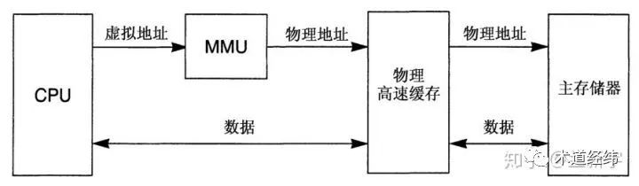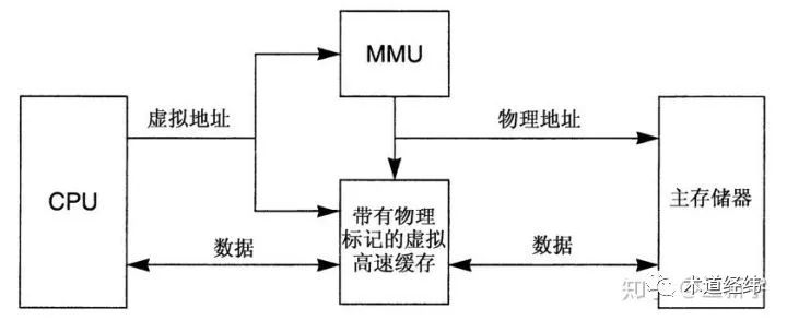 来自CPU的虚拟地址被同时发送到cache和MMU。这样一来,地址转换和存取cache在时间上就交叠在一起。在MMU转换地址的同时,cache也通过hash算法从虚拟地址得到index来开始它的查找操作。接着,cache能够读取被索引到的cache line的内容,为接下来的tag比较做好准备。一旦MMU转换好了地址,就把物理地址发送给cahce。随后,cacche把这个地址和选出cache line中tag里保存的地址进行比较,以判断是否发生了命中或者缺失。