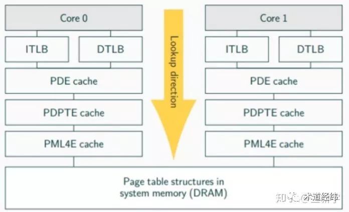 除了最后一级页表PTE的entry是直接指向page外,其他级的页表的entry都是指向下一级页表首地址的,因此这些级的页表被称为paging structure,所以PDE cache,PDPTE cache和PML4 cache被统称为paging structure caches。在ARM中,这些caches被称为table walk caches(名字应该是来自MMU里的table walk unit)。