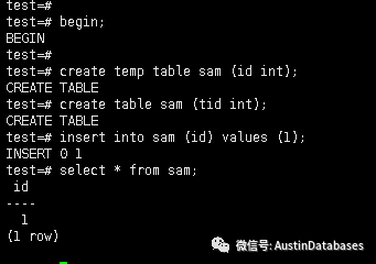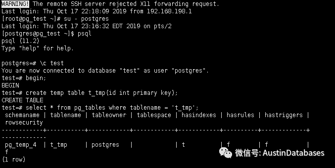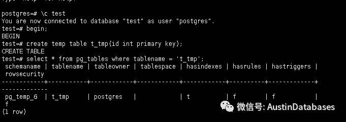 另外和有些数据库不同,PG的临时表会创建在你当前操作的数据库中,并且以t 开头进行命名(这里指的是在临时表的物理存储空间的名字)