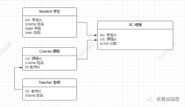 学生表Student 课程表Course 老师表Teacher 成绩表sc
