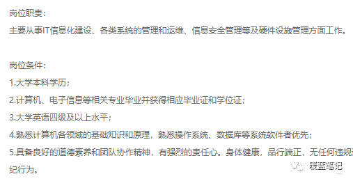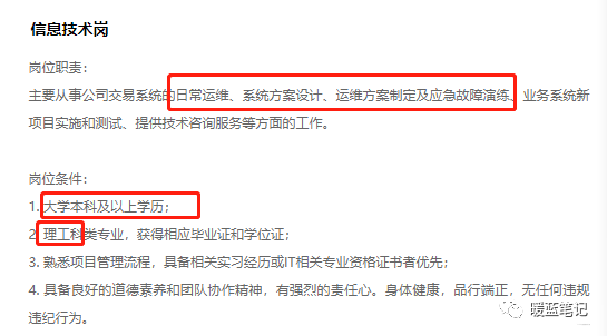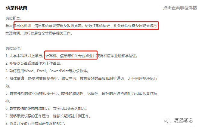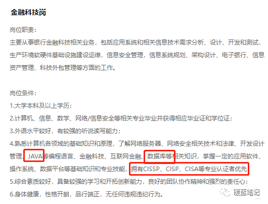 和其他行不一样的地方在于其有一条是CISSP等证书,其说明其对业务能力的重视程度,去银行的科技岗位,技术老旧是事实,如果你能技术+业务就会很棒了哦。
