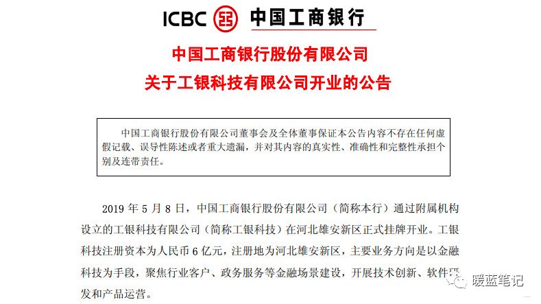 那就从2019 年说起,2019 年 5 月 9 日,其全资子公司 工银科技有限公司在河北雄安挂牌开业,注册资本 6 亿,这也是为数很少在非 "北、上、广" 成立的金融科技子公司。