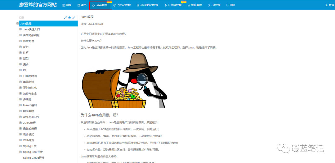我当时学习了他的 Python 教程和 Java 教程,是一个从基础到简单项目的在线博客,还可以在线编译运行了,还是比较方便的,推荐大家花时间看看,可能一两天就可以看了。廖雪峰学Java