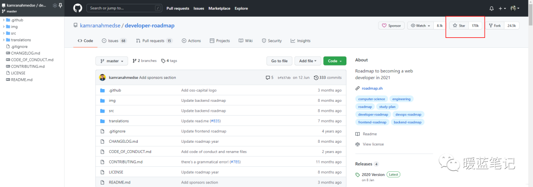 这个仓库是国外很火的开发人员学习路线,目前已经收获了 170 k star。