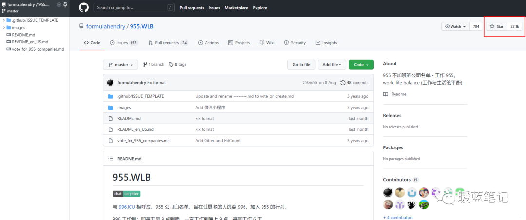 这份名单在 Github 上标星 21.1K,累计分支 934 个,这个项目与 996.ICU 相呼应,955 公司白名单。旨在让更多的人逃离 996,加入 955 的行列。链接直达