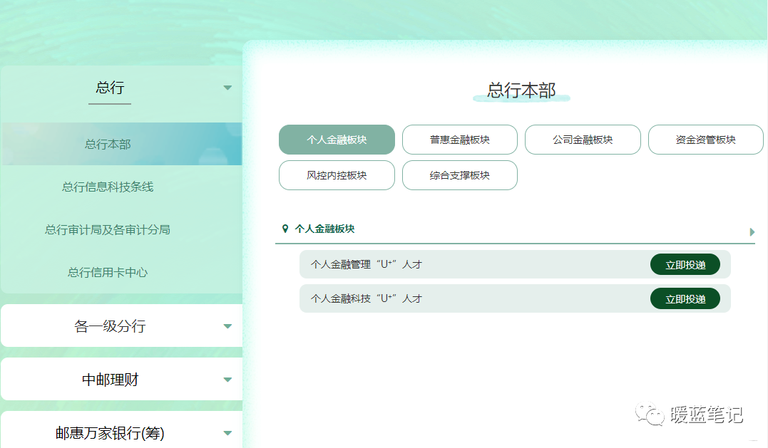 如果看过农行的招聘信息再看邮储的招聘简章,略显粗略,并没有直接看到诸如研发中心,数据中心等单独的招聘内容。