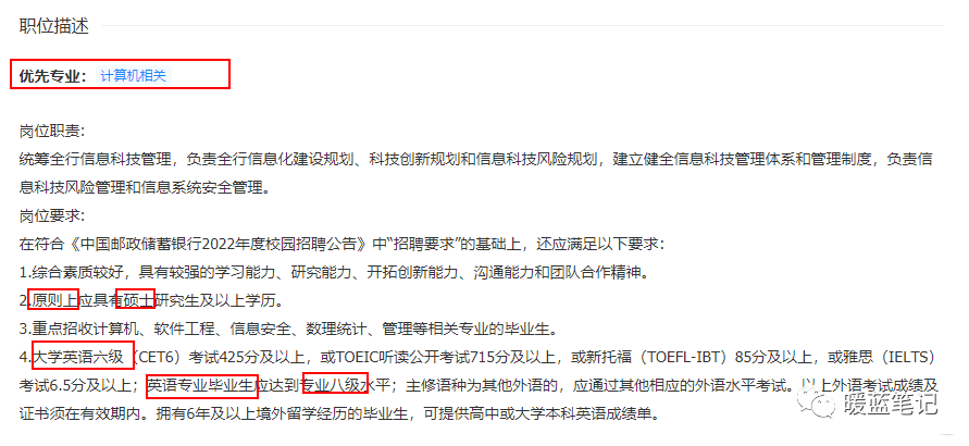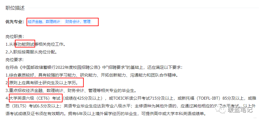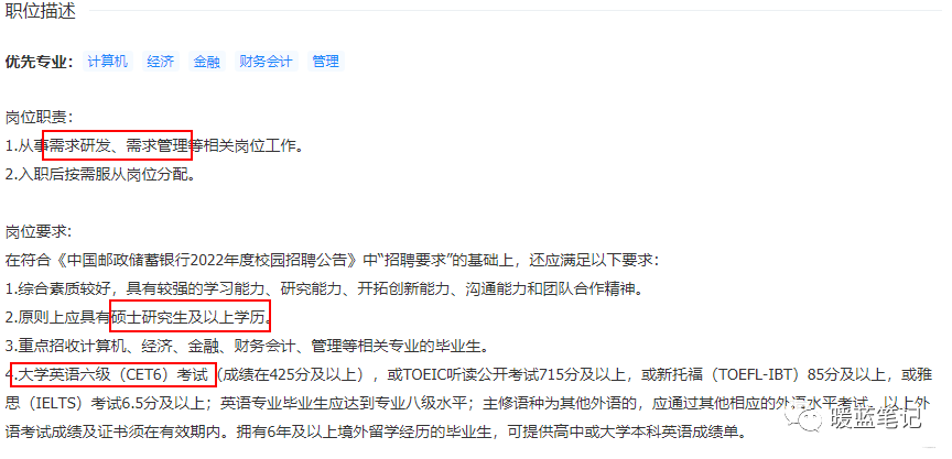 英语要求为六级,再次强调,如果还在大三或研一研二,想从事银行相关工作,好好准备四六级,六级过否就可以直接刷一批人了哦。