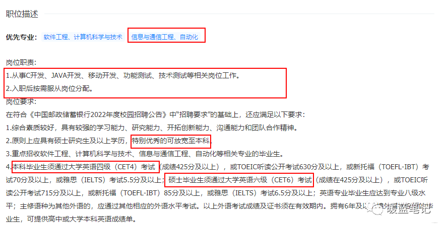 对比上面的招聘岗位描述区别还是蛮大的,首先就非常的直接,需要你有一定的编程技术储备,能够进行 C/Java等开发测试工作。另外从学历来看,这个岗位对于本科生而言,机会相比前面就会大不少,另外英语要求方面,如果是本科生,四级也即满足了要求。