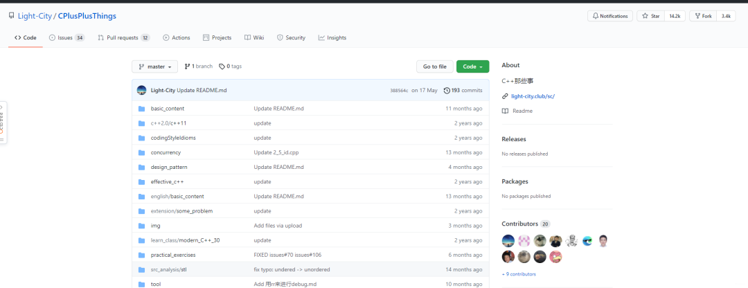 目前已经 14.2 k的 star,小伙子今年入职腾讯,C++相关的内容总结蛮到位,当然也有一些自实现的内容。