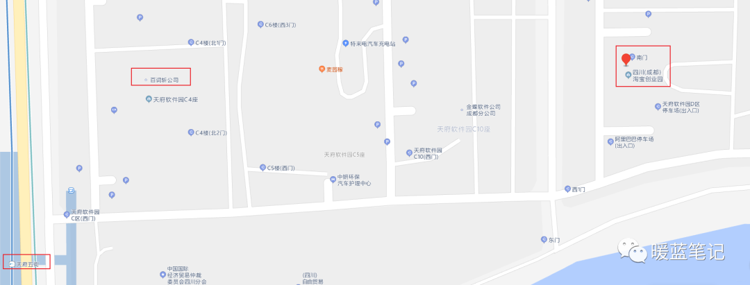 成都的互联网公司的地点基本上是天府软件园,紧邻地铁一号线天府三街和天府五街,下方的大部分公司也是在这个位置,如下图所示。