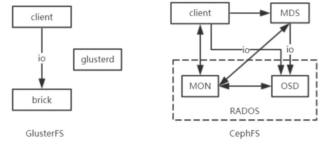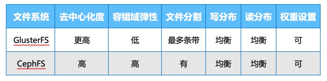如下图对比GlusterFS与CephFS,CephFS虽然MON和MDS都有避免单点故障的机制,但仍不可避免对可用性造成了影响,故首先在去中心化上显然GlusterFS更胜一筹。