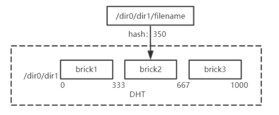 GlusterFS分布DHT用Davies-Meyer算法计算哈希的随机性来保证客户端同一个目录的子文件分布到各个存储单元中的随机性。同时客户端不同目录分布区间不同来保证不同目录下同一文件也可分布至不同存储单元。