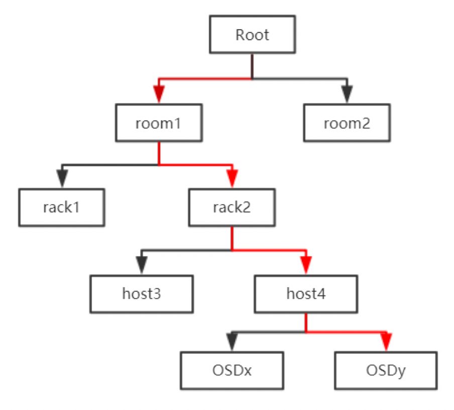 CephFS的Crush提供了更弹性的容错域划分。Crush提供了多个等级(比如机房,机架,主机等)的集群层级结构。其实际意义是PG在映射OSD时,通过哈希“长度”比较将不直接将OSD号参与计算而是层层往下寻找映射。而每个层级都能作为容错域设置。例如下图假设现在PG副本1已选择了OSDy,要选出下一副本,Crush规定了可以将host4屏蔽在其他host选出,也可以将rack2屏蔽,要在其他rack选出,甚至可以设置屏蔽room1,以达到双副本总是分布在不同房间的效果。