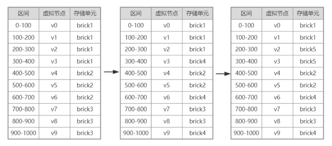 如下图所示扩容时虚节点映射改变,这个方法目前GlusterFS还尚未引入。同样如图,这种方法带来的文件定位复杂度提高和数据不平衡程度也有待检验。