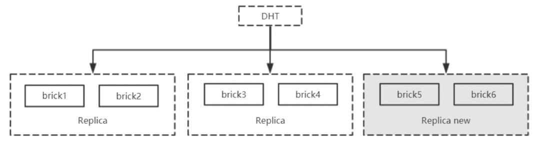 GlusterFS为了维持故障域级别和负载均衡,分布层面会希望扩容增加的存储单元是冗余份数的倍数。例如双副本模式,如图所示,总是希望能新增偶数个存储单元;而纠删码模式,例如4:2时,会希望能有6为倍数的存储单元扩容。