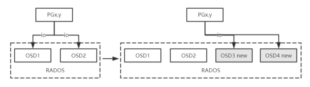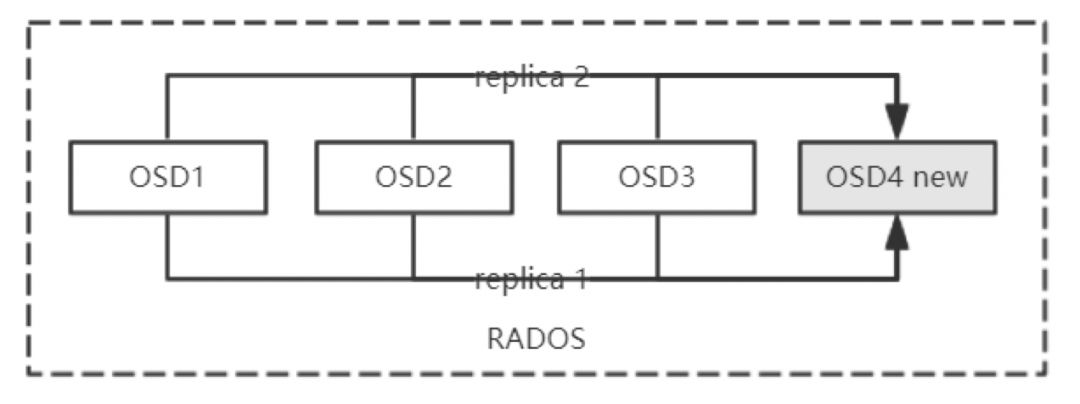 CephFS从扩容粒度来讲,无论扩展多少存储单元和节点都是平滑处理。例如下图双副本模式,部分PG副本1迁入新存储单元,部分PG副本2迁入新存储单元。
