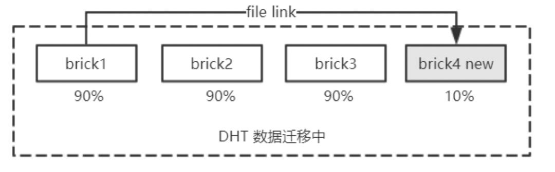 GlusterFS存在一套自动处理容量均衡的机制。例如一个新文件经计算将落入旧有存储单元,而旧有存储单元容量不足,此时会为文件创建一个链接至其实际落入的存储单元,之后读写请求将通过链接转发。