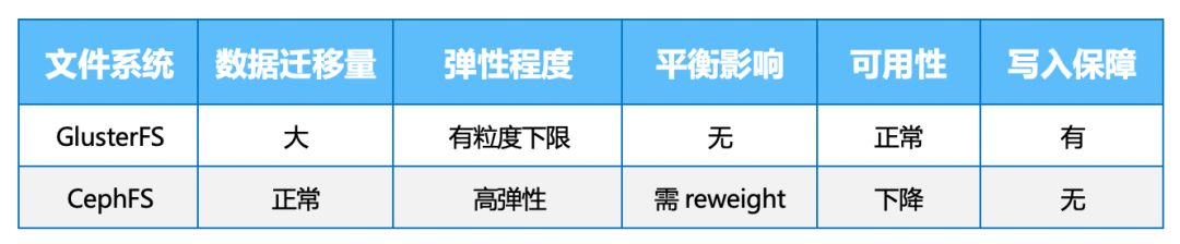 对比CephFS,GlusterFS数据迁移显得较为不合理,这是计算简单带来的负作用,对此现象,GlusterFS将在未来通过虚拟节点改进。
