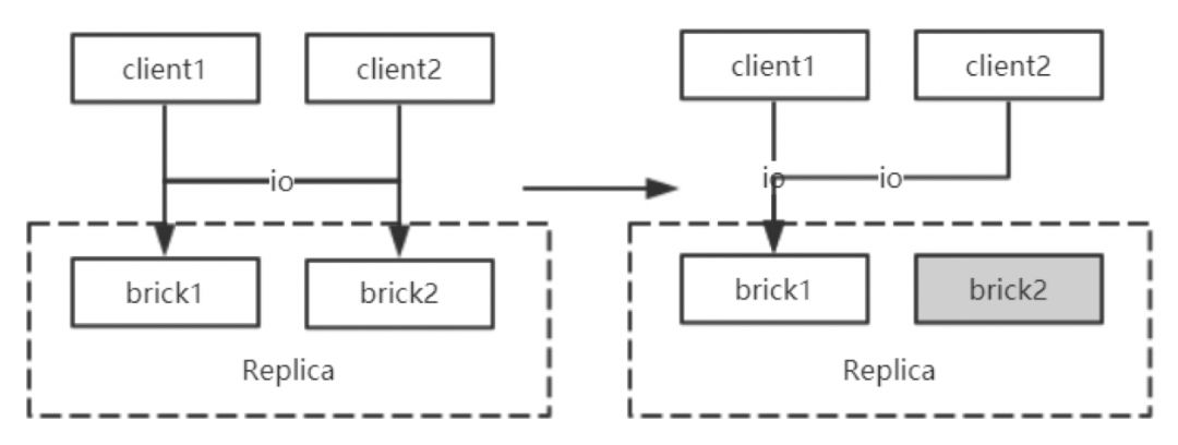 GlusterFS的去中心化结构使其在异常产生时,可用性得到了保障。以双副本举例,在一个存储单元异常后,客户端io仍然能够正常访问另一个存储单元不受影响。另外由于GlusterFS强烈的去中心化特性,其每个存储节点主机都是等价承担冗余工作的,考虑故障域划分也不会将双副本分布同一主机,所以单个主机异常和单个存储单元异常在副本模式下是同一类故障,处理方式类似。