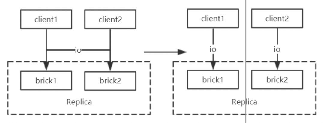 GlusterFS在处理网络分区问题时也使用类似逻辑,如图所示网络割裂情况,两副本甚至可以各自负载不同读写操作。