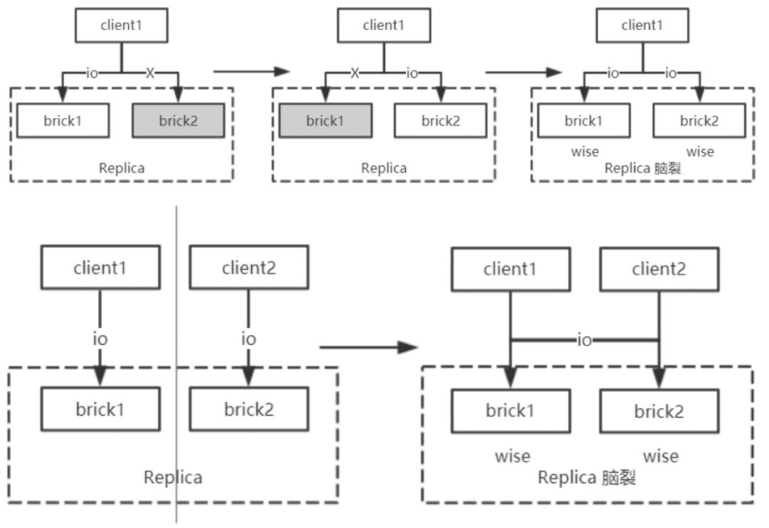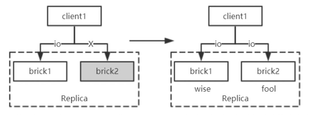 然而在上述一些异常情况中,最终正常时可能双副本都认为自己是wise的,它们判断不能互相覆盖,而是告警需要人工来确认正确数据。这就是GlusterFS在实际使用中产生的脑裂问题,此问题在网络波动中最为常见。