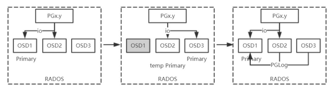 首先无论PG主从哪个副本失效,一段时间后PG将重新分布,在随后开始数据迁移以保证冗余度不变来维持正确PGLog数量优势;其次主副本失效,若重新分布后选择的新主未完成数据迁移,将有临时分布选取从副本代替主接受读写请求;然后无论是否开始迁移,迁移完成与否,对于冗余度不足的PG总是标记降级,PG中冗余度不足的对象写入受限;最后MON的Paxos算法维护了PGMap版本的顺序性,使任何时期的主副本都能获取PGMap的所有变化从而能从所有经历过的OSD获取PGLog拼合权威PGLog完成自身恢复。