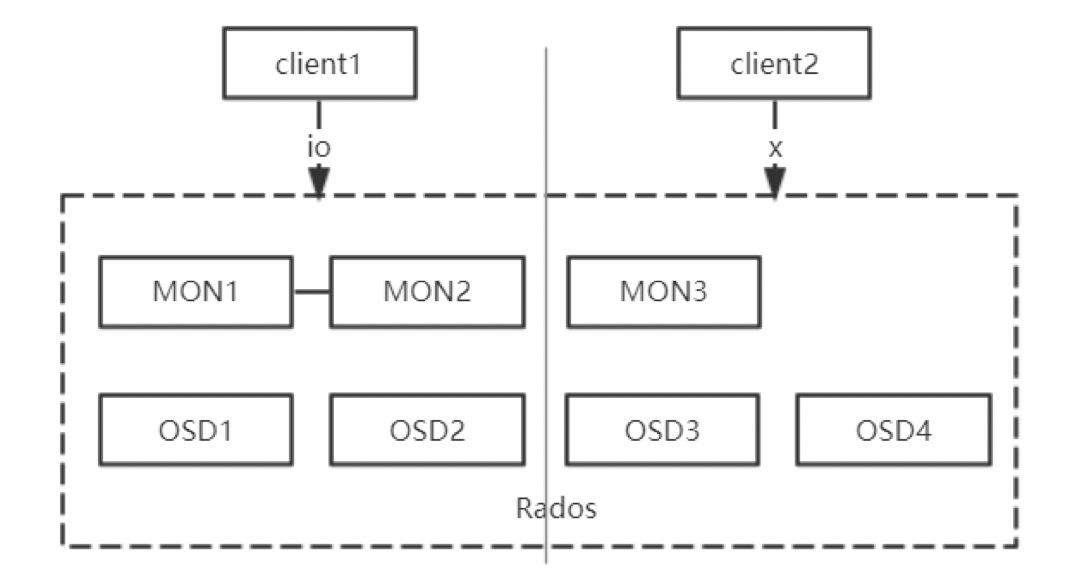 同时MON中Paxos算法对强一致性维护起决定作用,故MON通信等异常时,集群为维护强一致性应当停止服务,可用性大大受限。故MON本身通过Quorum来避免这种尴尬情况,然而在最小份数不足时MON无法继续为客户端提供各类Map更新。如下图所示,网络分区,网络波动时MON总是只能为一边继续提供可用性。