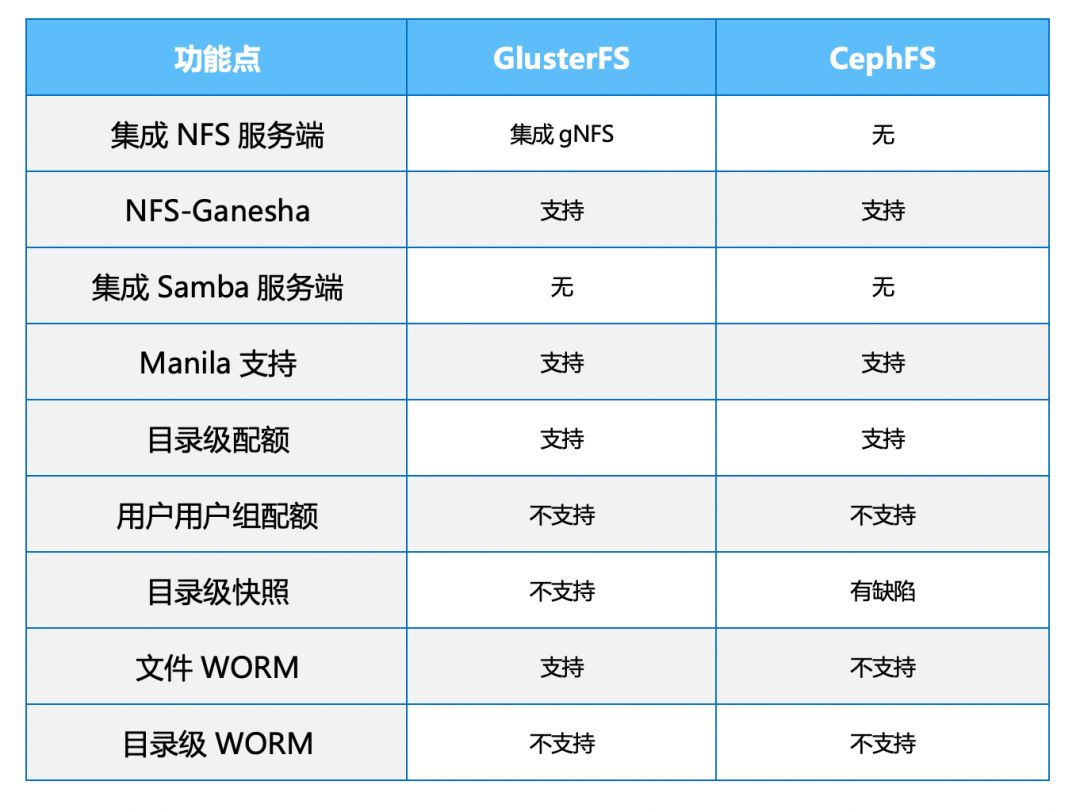 另附GlusterFS 3.12.x与CephFS 12.2.x在一些加分功能上的对比表,作为深入开发的参考。