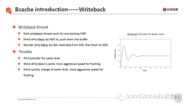 为了保证刷脏性能,同时尽量不影响业务IO的读写,bcache会根据脏数据的水位线来调节刷脏速率,具体是通过比例-微分控制器(PD-Controller)来实现的:当水位线越高,或者水位增高速度越快时,刷脏速度也越快。