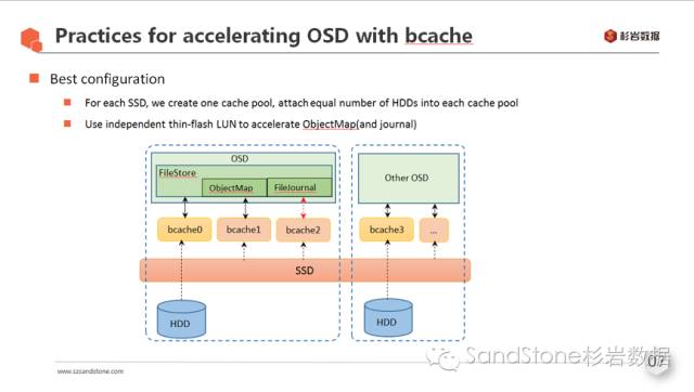 杉岩在使用bcache加速ceph OSD时,采取如上图所示的方式: