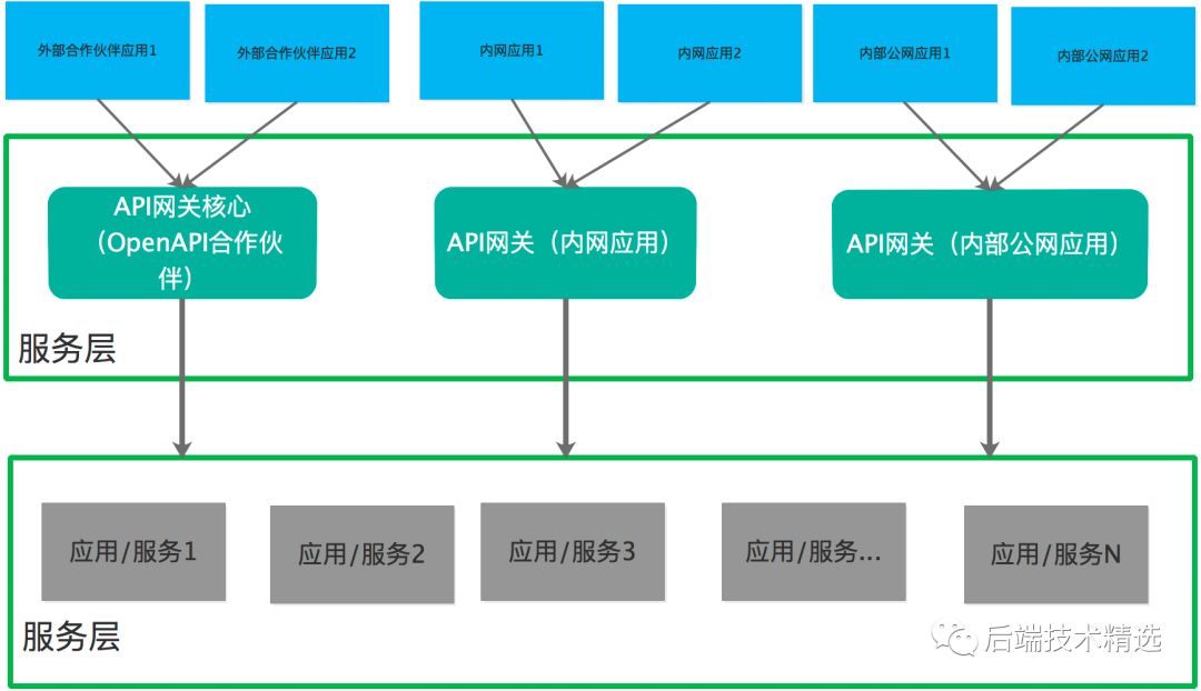 因此在我的设计中将这三种应用分别用不同的网关进行API管理,分别是:API网关(OpenAPI合伙伙伴应用)、API网关(内部应用)、API网关(内部公网应用)。