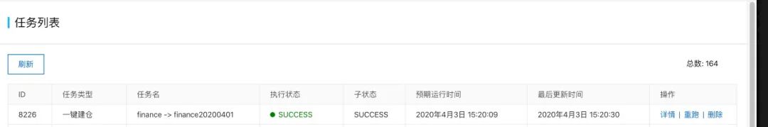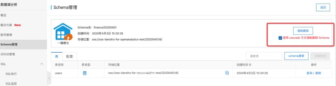 此时,就可以吧一键建仓的finance20200401删除了,我们后续要查询的归档数据就用20200401_snapshot 这个schema就可以了。