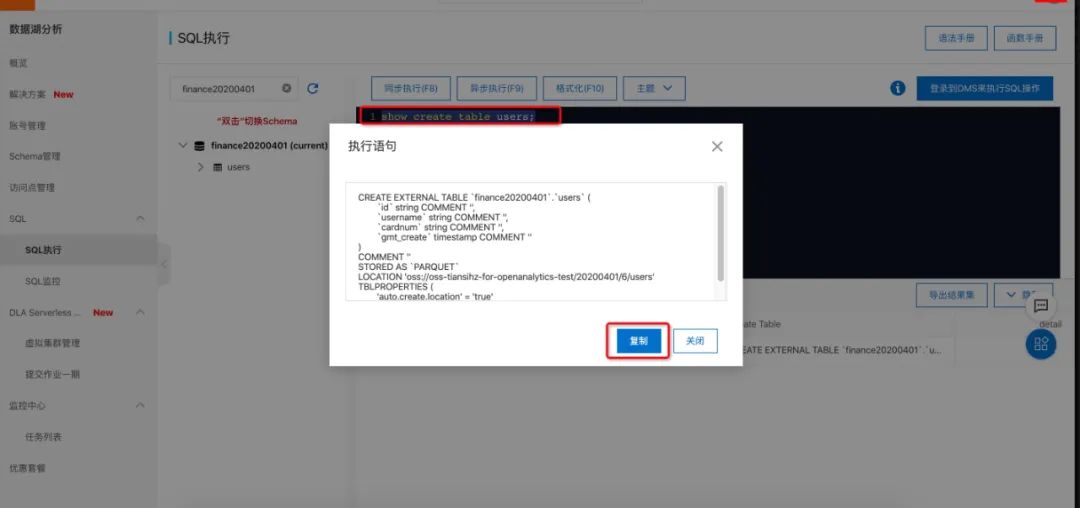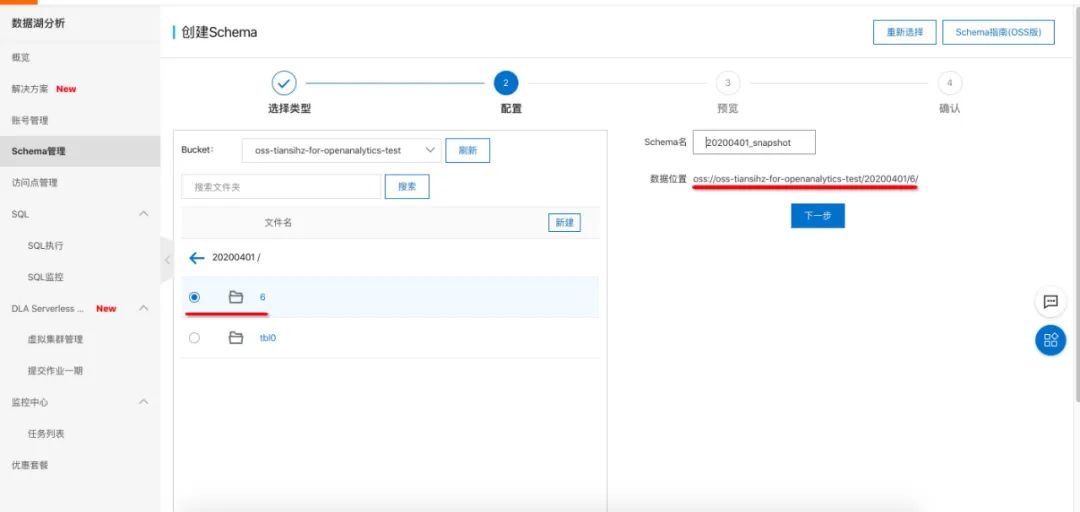 如图,核心确保这个schema映射到了“oss://oss-tiansihz-for-xxxxx-test/20200401/6/”