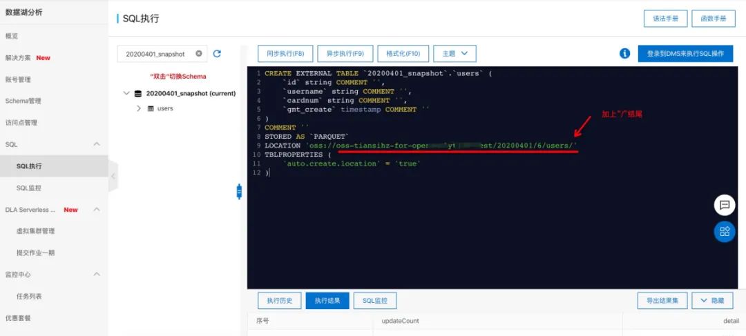 20200401_snapshot在sql控制台把之前复制的users建表语句粘贴进来,并在location路径最后加上“/”结尾