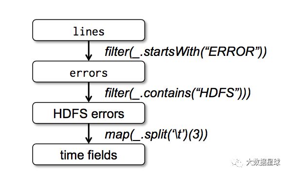 图中每个长方形都是一个RDD,但是他们表示的数据结构不同,注意,这里用的是”表示“,而不是”存储“,例如lines这个RDD,就是最原始的文本行,而errors这个RDD,则只表示以”ERROR“开头的文本行,而HDFSerrors这个RDD则表示包含了”HDFS“关键字的文本行。这就是一个RDD的”变形“过程。好了,我们回到上边纠结的”表示“和”存储“两个字眼上,看看用不同的字眼表达会有什么不同的结果。如果我们用”存储“,那么上一个RDD经过transform后,需要存储下来,等到积攒一批后交给下一个处理逻辑(类似我们以前用迅雷下载电影,要先下载才能观看,两个过程是串行的)。那么问题来了,在一批数据达到之前,下一个处理逻辑必须要等待一段时间,这其实是没有必要的。所以在上一个处理逻辑处理完一条数据后,如果立马交给下一个处理逻辑,这样就没有等待的过程,整体系统性能会有极大的提升,而这正是用”表示“这个词来表达的效果(类似后来的流媒体,不需要先下载电影,可以边下载边观看),这也就是是spark中的pipeline(流水线)处理方式。