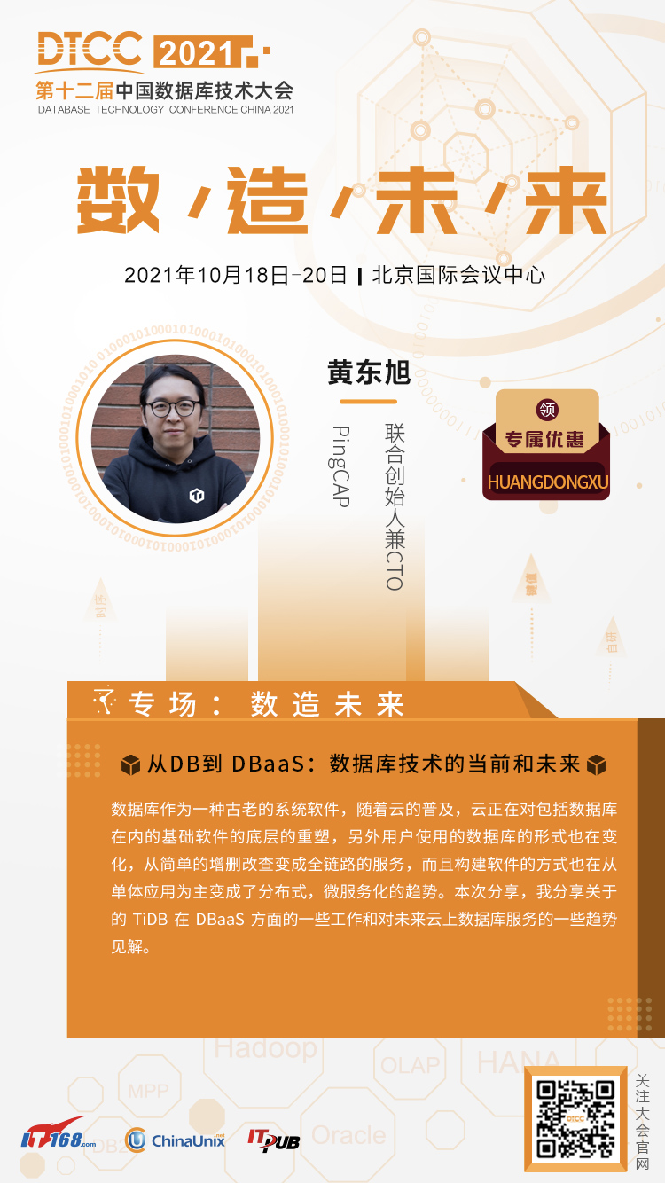 在本次大会上, PingCAP 联合创始人兼 CTO 黄东旭将与大家分享 TiDB 在 DBaaS 方面的相关工作和对未来云上数据库服务趋势的见解,欢迎大家报名活动~