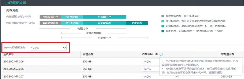 物理主机虚拟内存包含物理内存(内存条,高速)+ SWAP(硬盘分区、龟速);物理内存不够时,系统会根据配置使用SWAP分区(深信服超融合在平台上默认设置“尽量不用SWAP”的策略)。vMEM超配本质是假设给虚拟机分配32G内存,虚拟机实际占用只了24G,理论上8G(32G-24G=8G)是可以回收的,这回收的部分理论上可以给其他虚拟机用。此时,就需要用到KSM(没有安装aTool的生效)或者气泡内存技术(安装了aTool的生效)。但内存超配可能会造成系统物理内存耗尽,导致系统卡顿的情况。因此,在核心系统上,要控制超分内存的比率,或者不要超配。