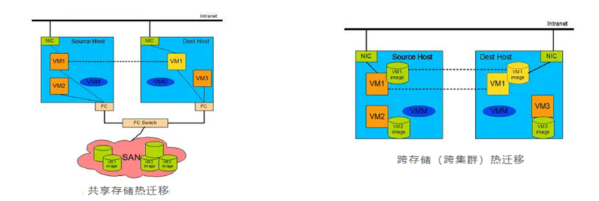热迁移分为两种形式,一种是共享存储热迁移,此种热迁移形式,需要虚拟机镜像在共享存储上,此种迁移类型,只需要通过网络发送客户机的vCPU执行状态、内存中的内容、虚机设备的状态到目的主机上。另一种是跨主机跨存储热迁移,与跨主机不跨存储热迁移类似。不同的是其需要在目的存储创建相同配置的虚拟机镜像(空白的,没有数据),之后仍然是在目的宿主机上启动目的端Qemu进程, 目的端Qemu镜像打开新创建的镜像文件。另外还需要传送源端虚拟机的磁盘数据到目的端。