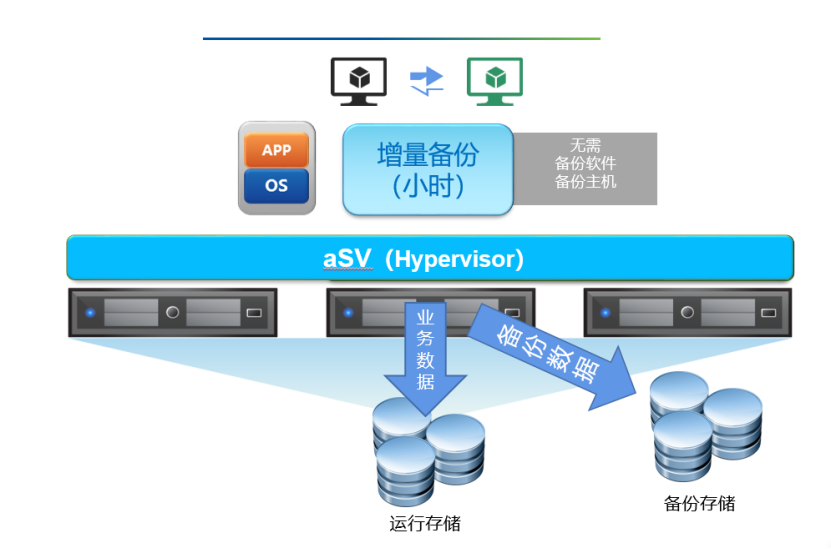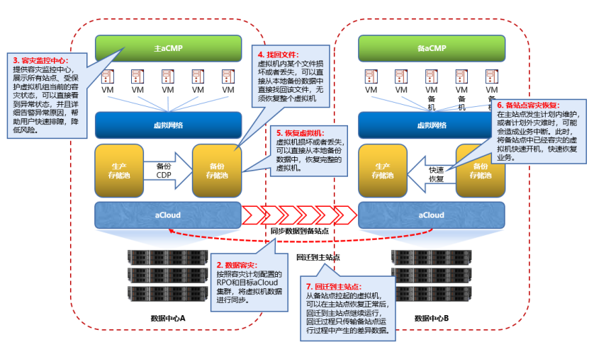 深信服采用“本地备份-异地容灾”的方案,本地提供秒级的持续数据保护方案,当虚拟机出现故障时,可以快速从本地的保护数据中恢复整台虚拟机;异地提供不同RPO(1秒、10秒、10分钟、30分钟、1小时、2小时、4小时、8小时、12小时、1天、2天、一周)的虚拟机级容灾功能,主、备站点皆为深信服的企业云平台。