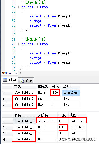 /*使用说明:Old数据库为DB_V1,New数据库为[localhost].DB_V2。根据实际需要批量替换数据库名称脚本来源:https://www.cnblogs.com/zhang502219048/p/11028767.html*/-- sysobjects插入临时表select s.name + '.' + t.name as TableName, t.* into #tempTAfrom DB_V1.sys.tables tinner join DB_V1.sys.schemas s on s.schema_id = t.schema_idselect s.name + '.' + t.name as TableName, t.* into #tempTBfrom [localhost].DB_V2.sys.tables tinner join [localhost].DB_V2.sys.schemas s on s.schema_id = t.schema_id-- syscolumns插入临时表select * into #tempCA from DB_V1.dbo.syscolumnsselect * into #tempCB from [localhost].DB_V2.dbo.syscolumns-- 第一个数据库表和字段select b.TableName as 表名, a.name as 字段名, a.length as 长度, c.name as 类型into #tempAfrom #tempCA ainner join #tempTA b on b.object_id = a.idinner join systypes c on c.xusertype = a.xusertypeorder by b.name-- 第二个数据库表和字段select b.TableName as 表名, a.name as 字段名, a.length as 长度, c.name as 类型into #tempBfrom #tempCB ainner join #tempTB b on b.object_id = a.idinner join systypes c on c.xusertype = a.xusertypeorder by b.name--删掉的字段select * from(select * from #tempAexceptselect * from #tempB) a;--增加的字段select * from(select * from #tempBexceptselect * from #tempA) a;--select * from #tempA--select * from #tempBdrop table #tempTA, #tempTB, #tempCA, #tempCB, #tempA, #tempB