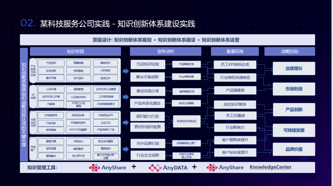 知识战略是组织战略目标达成的关键支撑。以某科技服务公司为例,其知识管理咨询服务包括三大部分:知识创新体系规划、建设和运营。爱数提供集AnyShare、AnyDATA和 AnyShare Knowledge Center为一体的新服务企业知识工具,助力企业充分释放数据价值。