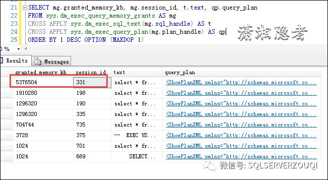 SELECT mg.granted_memory_kb, mg.session_id, t.text, qp.query_plan FROM sys.dm_exec_query_memory_grants AS mg