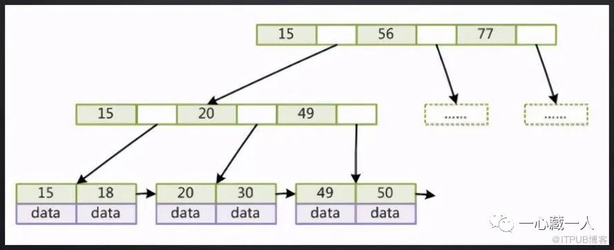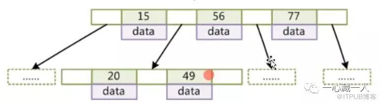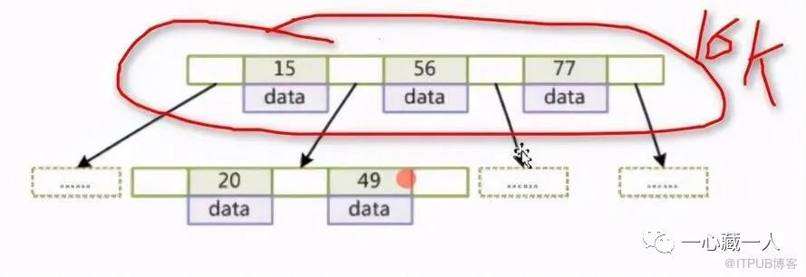 如果我们要查找49这个元素,实际上是从根节点开始查找的,它一次性将根节点这个大节点一次性load到内存里,然后用要查找的元素在这里去比对,49大于15小于56,在15和56之间有一个节点存储的是下一个节点的磁盘地址指向下一个节点(这个节点的索引都是大于15小于56的),然后再将这个节点一次性load到内存去找这个元素,然后比对就找到了。