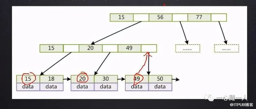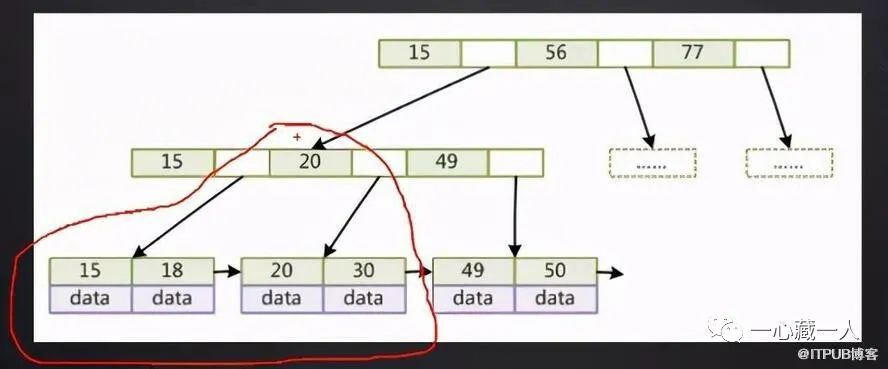那B-Tree没有这个指针的话查找大于20 的元素那得多麻烦,先找出第一个节点中大于20的全部元素,因为还有别的节点,所以又要从根节点去遍历找下一个叶子节点,是不是非常慢。没有这个指针每次都要从根节点开始查找然后合并,那是非常慢的。