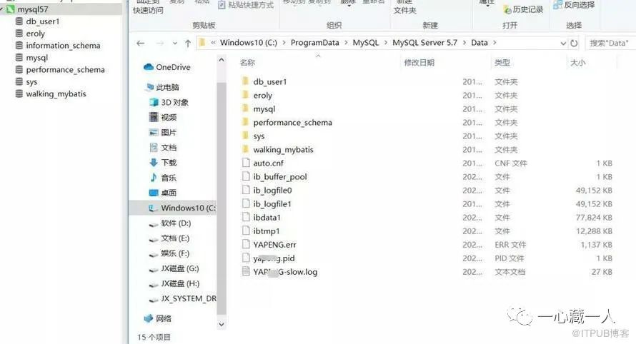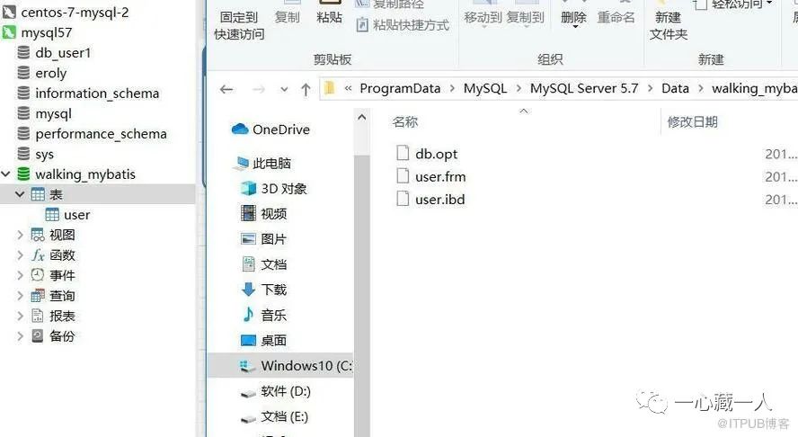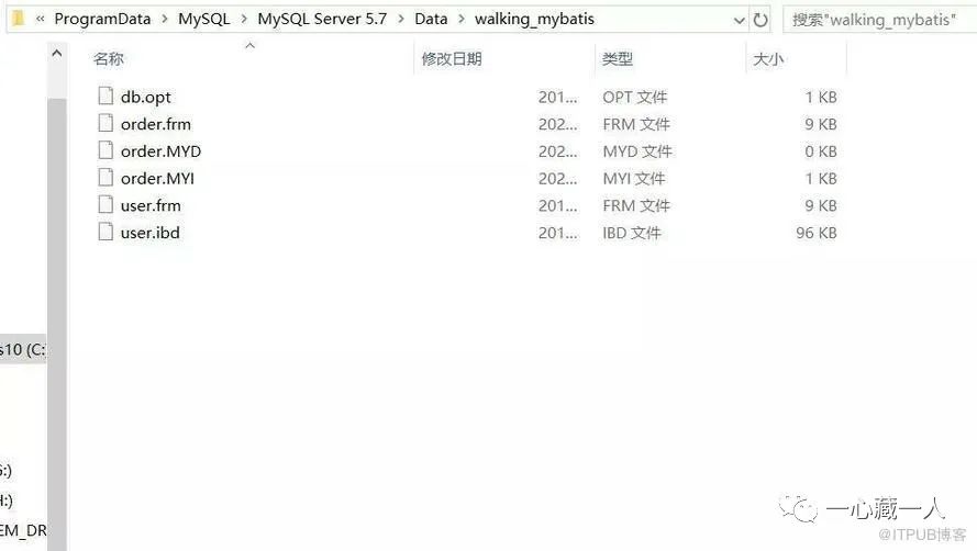 我们打开一个walking_mybatis数据库看一下有一个user表,再打开对应的文件夹看一下,里面的文件名和表名有关系,然后有不同的后缀,这里面的不同的放法和mysql的存储引擎有关,和你选择的哪种存储引擎有关。